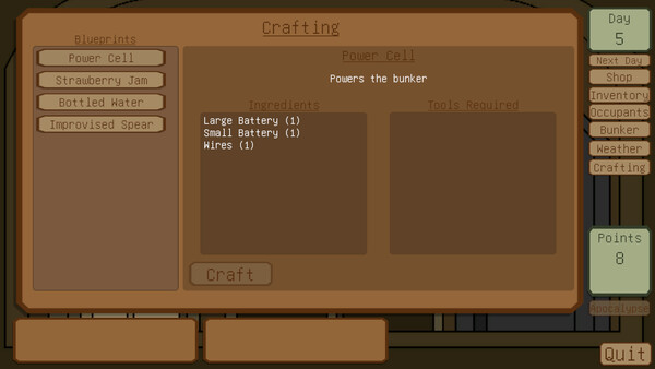 The Prepper is a turn-based survival management game where you manage a bunker, ration supplies, and make tough choices to keep your survivors alive through a collapsing world. Every decision matters—how long can you survive?