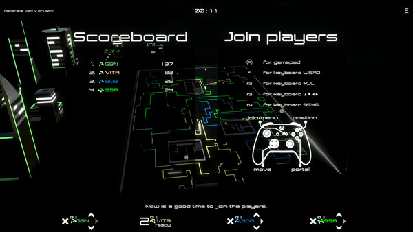 Hardtrace is a party arcade game for up to 12+ players on one screen. You can win by precisely maneuvering your vehicle in point-loaded zones, or by waiting for a more greedy player to do the precise work for you. Your portals, which you can use to jump around the arena, will come in handy for this.