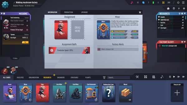 Factory Planner is a card-based simulation and strategy game where you build and manage a factory. The goal is to combine different cards to create unique factories, offering players a full sandbox experience with endless possibilities for customization.