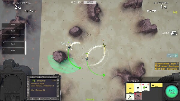 Command a fighter squadron in turn-based dogfights. Click and drag to plan your moves. Predict and outmaneuver your opponent. Manage your aircraft and pilots across a dynamic campaign map.