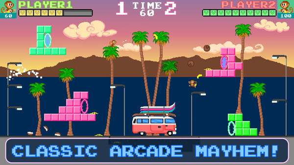 Monkey Fruit Fight! mixes PvP retro arcade vibes and modern competitive action! Master precise platforming and throw fruit weapons in intense pixel art duels. Dominate friends to an electrifying synthwave soundtrack! Easy to learn, difficult to master - perfect for all ages!