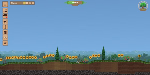 Watch a simulated 2D world including weather, plants, animals, and humans in this casual sandbox game about nature and life. Start meteor showers, spawn new animals, or just let things play out naturally. It's like a screensaver you can play.