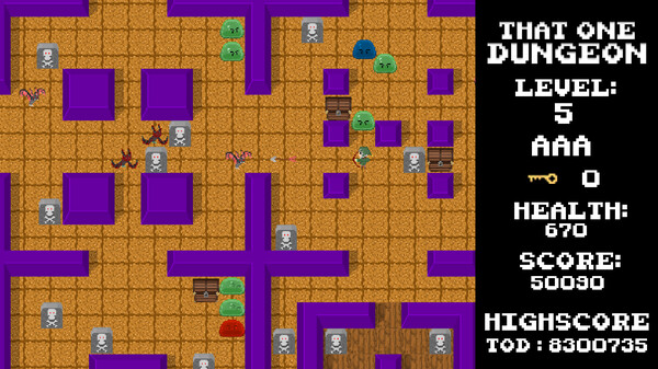 That One Dungeon is a fast-paced dungeon crawler filled with never-ending levels, monsters, and traps! Choose your class and shoot them down to obtain your best score yet! Navigate through a labyrinth-style dungeon while trying to find hidden secrets and evade your inner fears!
