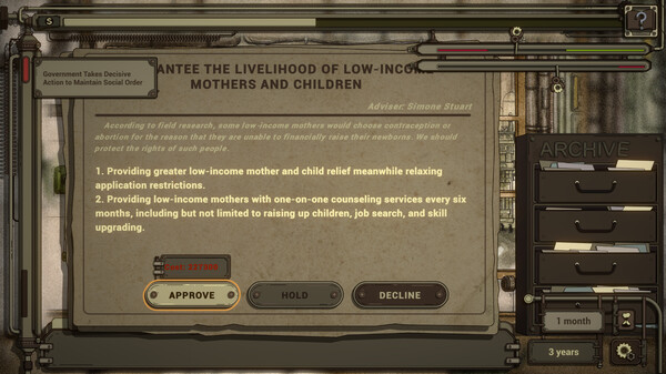 Fertility, Crime, and Economy is a political game with rouge-lite elements. Be the governor of the Province of Alva, improve the birth rate, decrease the crime rate, and improve the economic development by applying different policies to the society. Be careful, there might be consequences.