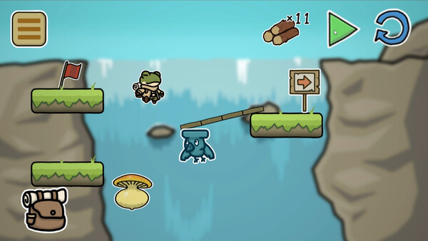 Cinch Bridge is a 2D physics-based puzzle game built around trial and error. The rules are simple: guide the protagonist to the goal. Place gimmicks, watch the outcome, and use bouncing mushrooms and gusts of wind to lead the character to safety.