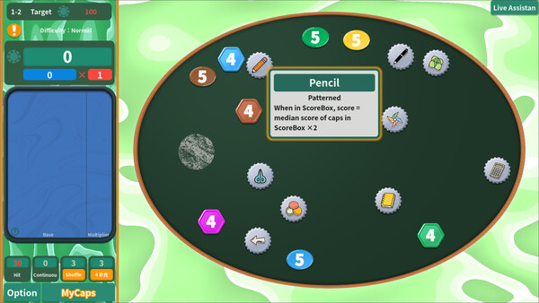 A Roguelite deck-builder with pool-style controls. Refine your cap combos, hone your shot skills, and use “Base × Multiplier” to rack up a high score!