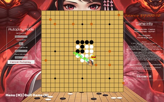 SpiralGo is a turn-based, casino-style twist on Go. Bet against the house, predict spiral stone patterns, and try to outsmart the casino! Risk, reward, and strategy collide in this minimalist board game with a gambling soul. No real money betting involved. Just some wholesome spiral fun!