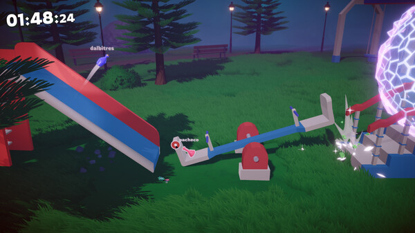 A couch/online game where you battle your friends with unique and wild abilities. There are many choices such as a shrink ray, creating black holes, stopping time and attaching a rocket engine to the stage to send it flying. Choose a combination that synergizes well to win the round!