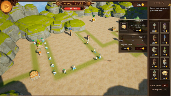 TD Tactics is a combination of Tower Defense and Auto Battler genres. Use your cards to cast spells, combine and upgrade towers, and make use of different synergies to defeat your enemies.