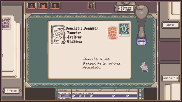 Welcome to Anssoloin's new postman! After years of hard work, you've finally been able to buy your own post office by the sea. Learn more about the village and its residents through your work. Will you be able to fit in your new community? Sort the mail, discover new things, chat, and relax.