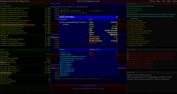 A magitech, post-apocalyptic, turn-based RPG. Assist your faction with exploration, resource gathering, construction, research, item fabrication, and monster extermination, while absorbing ambient mana and leveling up your System drone.