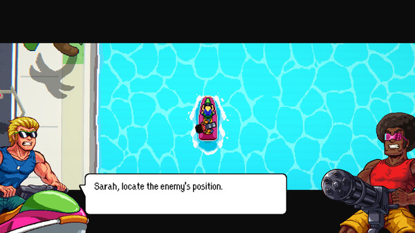 Grab a partner and work together to defeat crime on jetskis! Jet and Sky are two old friends from high school who spend their days keeping The City safe from criminals with the help of Sarah3000, the latest in artificial intelligence for jetskis.