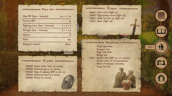 Small in scope, detailed, gritty text-based fantasy RPG. Recreates the gameplay of the old gamebooks. Simple battle system and hassle-free inventory management.