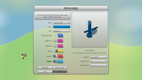 In this turn-based, tactical tennis simulation you build, control and improve your own tennis robot. Play on grass, clay and hard courts and balance your energy, precision and condition throughout the match. Maintain and develop your robot between matches.