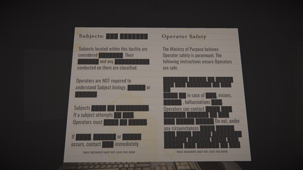 The Ministry of Purpose has conscripted you as a Terminal Operator, tasked with overseeing a secure containment facility. Your purpose is to lock doors, assign tasks to staff, meet your shift requirements and ensure the containment of all subjects - all from the "safety" of your terminal.