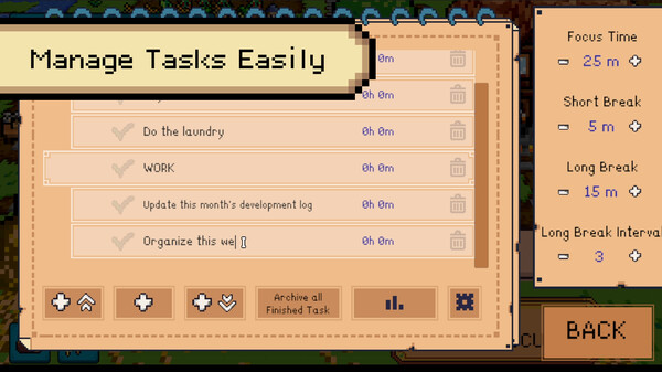 This idle RPG adventure is based on the "Pomodoro Technique." Complete focused work sessions to advance your character's exploration. To reclaim the Goddess's Hourglass and restore peace, the hero must defeat the evil dragon "Procrastination" and its minions. The world’s fate is in your hands!