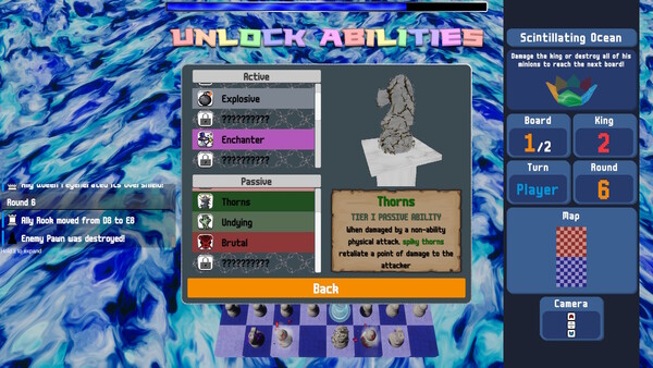 An exciting and fast-paced chess roguelite, full of ridiculous abilities! Explode your opponent's pieces, spawn queens all over the board, move twice in a row... But watch out for the bosses, who have crazy powers of their own!