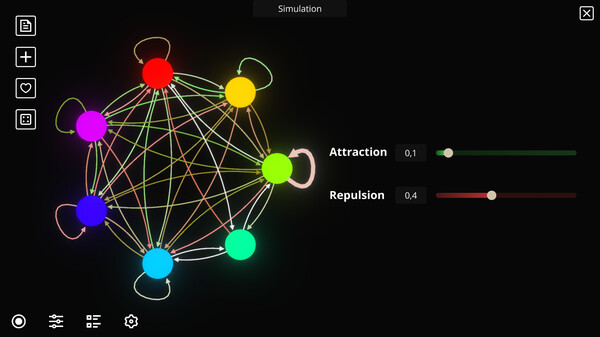 Artificial Life Simulator is a relaxing and colorful simulation game where you create artificial life forms based on particle interactions. The particles interact with each other through forces, resulting in unique emergent behaviors.
