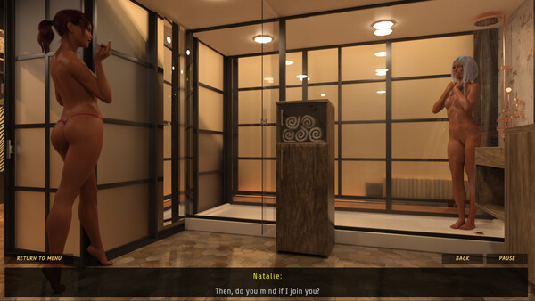 Enjoy an erotic visual novel featuring two hot women and an engaging sex simulator. Juliette and Natalie book a reservation at a luxurious SPA. The warm shower, the hot sauna and being alone in the entire SPA, is just too inviting and they quickly engage in sex, in the hot sauna.