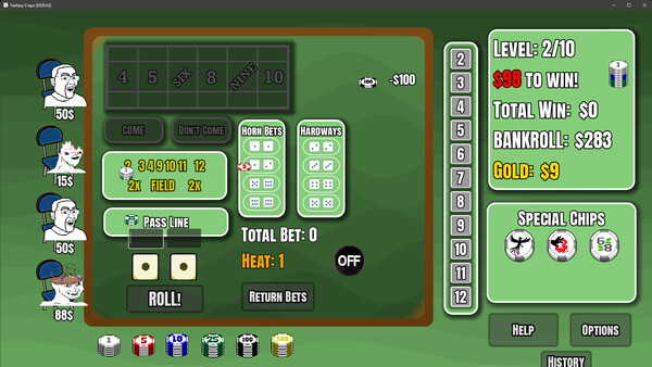 6 ways to 7 is a high-stakes roguelike twist on the classic dice game Craps! It combines the hard choices of a roguelike, with the push your luck gameplay of craps!