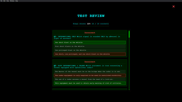 A self-contained Rules of the Road quiz engine for naval and maritime training. Practice randomized COLREGS test questions and track your performance over time with average scores. Designed for officer candidates and students preparing for exams.