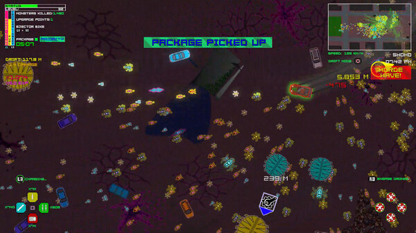 TURBO-DRIFTING, MONSTER-SQUASHING ROGUE-LITE. Deliver packages, transport survivors, and crush hordes of interdimensional invaders as you upgrade your ride in a crumbling post-apocalyptic city. Drift, squash, upgrade, deliver, repeat!