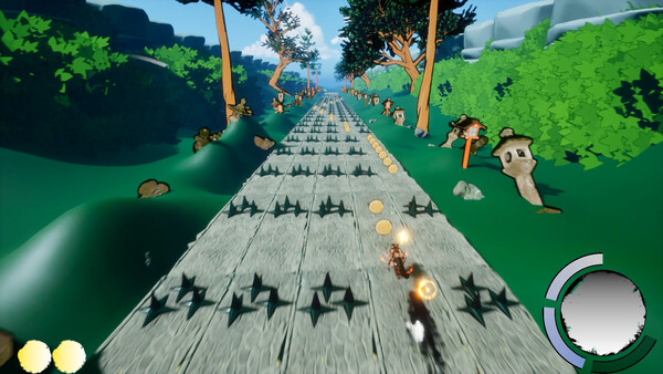 DodgeAndRun is a simple run-and-jump type game. The game is played from a third-person perspective, and players can move between five lanes. The player moves through the stages, avoiding various obstacles (spikes, logs, blocks, etc.) by jumping and moving.