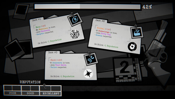 A terrible syndicate has infiltrated society, explore cases, listen to what the citizens have to say, and use that information to route out the good from the evil in this roguelike deduction game. Can you uncover the head of the syndicate? Or will you be duped like the rest?