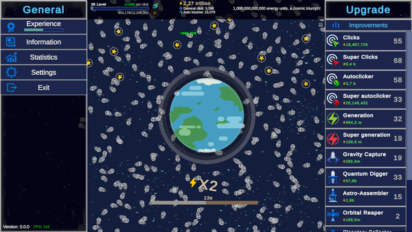Clicker Astro Planet: collect energy, XP, eggs! Buy planets, level up, track stats!