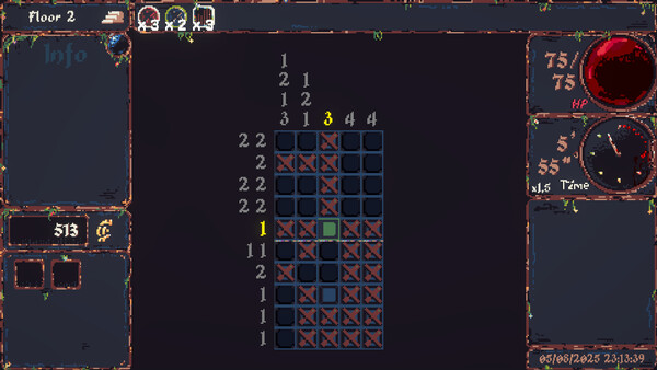 CiniCross is a roguelike puzzle game set in a dark fantasy universe. Solve increasingly difficult nonogram puzzles, choose your path through a tree-like dungeon, and adapt your strategy using artifacts and items with unique effects. Each room is a new puzzle, each boss a challenge to overcome.