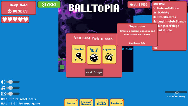 Plinko Panic! is a roguelike 'board-builder' about using a set of pinballs and a pachinko board in order to delve through dungeons and defeat numerous enemies. Buy a new pinball at the end of each round and see just how far you can get!