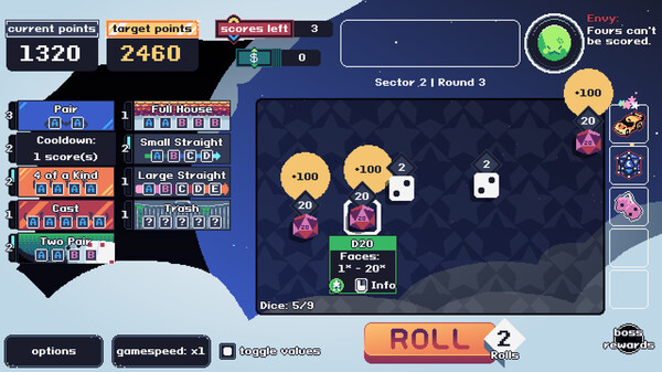 Welcome to a dicey roguelike! Roll, buy, and sell a plethora of wild dice, scoring hands, and items to tip the scales of Lady Luck in your favor. Find unique dice that fit your build and unleash powerful synergies to dominate each roll.
