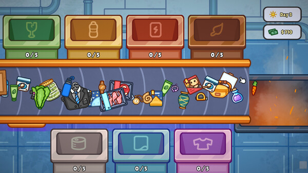 Work at a recycling facility! In this tactile cozy job simulator, sort discarded items into categories, process them into raw material and sell valuable items for money. Could be trash or treasure! Upgrade your workflow, sort and process efficiently.