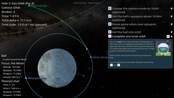 Hit your ball on orbital trajectories around a realistically sized solar system. Discover the secrets hidden in the planets and moons, learn orbital mechanics, and boldly go where no golf ball has gone before.