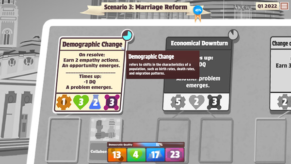 Build a healthy democracy and shape the future of Europe in this Free Card Game. Play Cards as actions to balance the demands of Politics, Economy, Science, and Society in different political scenarios.