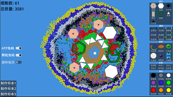 This is a cell survival and construction game. The player initially starts as a perfect hexagonal cell and expands the cell population by collecting and transporting various particles to build themselves. They engage in battles with other organisms and gradually develop into a cellular empire.