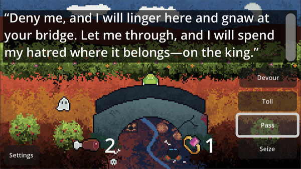 A roguelike survival sim where you rule your bridge as a cunningâor ravenousâtroll. Eat, toll, or spare travelers to balance hunger, greed, and favor as you choose whether to become a feared predator⊠or a worshiped guardian of the bridge.