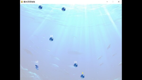 The player transforms into a deep-sea diver and uses the keyboard directional keys (↑↓←→) to control the movement of bubbles. The player and each bubble display a number above their head, and each time a bubble is successfully swallowed, the player's number is incremented by 1.