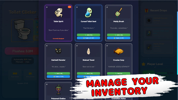 A hilariously absurd idle clicker where you flush toilets to collect bizarre items, and build the ultimate toilet collection with community-voted additions.