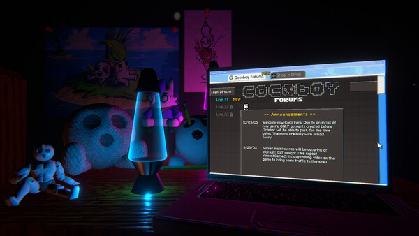 COCOBOY is a 2D puzzle platformer within a 3D retro gaming simulation. Hack an ’80s cult classic with modded abilities, decorate your bedroom with rare collectibles, and scour a 2005 gaming forum where a peculiar fandom takes root.