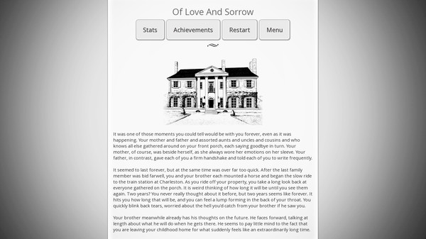 Of Love And Sorrow is a 120,000 word interactive visual novel following the story of two young brothers from the South during the Civil War, separated by war, love and betrayal. The choices you make will direct the story - their lives, their loves, their very destiny is up to you.