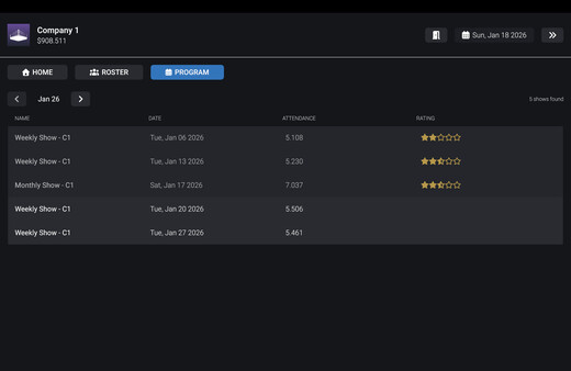 Create and simulate wrestling shows, book matches, and compete with rival promotions in a dynamic pro wrestling world.