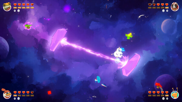 Off the Beaten Track is a couch/online arcade action game where you play as quirky animal pilots in ridiculous flying machines, battling across vibrant cosmic arenas with a wild mix of over-the-top weapons.