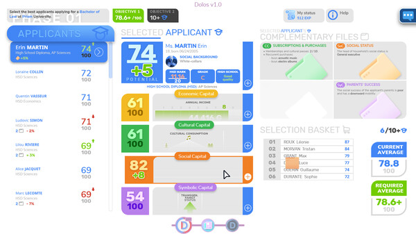 A sci-fi political thriller. Live the life of an operator of DOLOS, a social regulation system predicting everyone's future. Analyze applicants' profiles and decide about their lifetime career. Apply DOLOS' logic or find how to counter it ... but don't get fired!