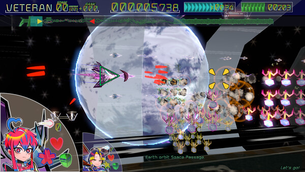 "3D STG with a 2D feel! Join the adventure to save the solar system! Ace pilots Louloudi & Asteri fight a massive virus. Twin-stick controls, sidestep & roll, dodge enemy attacks. Shield-life system for beginners; damage auto-recovers. Normal & Hard routes for all players!"