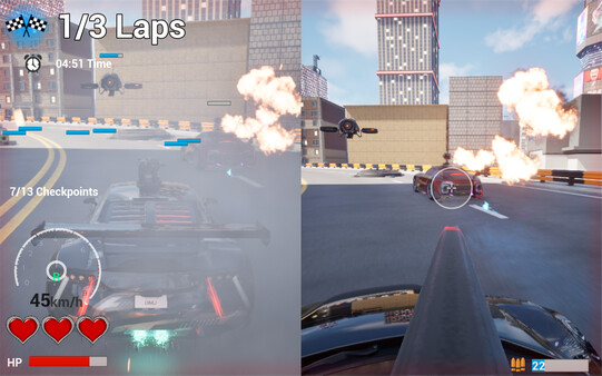 Arcade racing meets time-attack shooting. Fight off gun-wielding enemy cars and hazard-spawned chasing drones to earn extra time and finish the track. Solo or local 2-player co-op (driver/gunner split). 4 tracks, weapons: Laser Beam & Charge Shot.