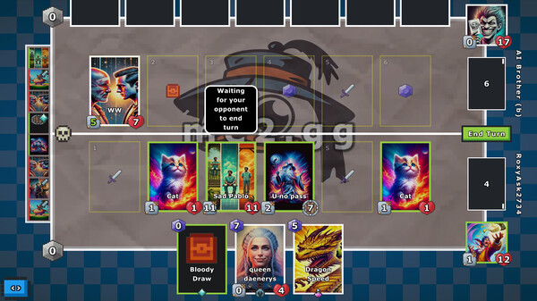 Meme turn-based card game between two opponents, using constructed decks of 20 cards with a selected hero with a unique power. Players use their limited tear crystals to play abilities or summon minions to attack the opponent, with the goal of destroying the opponent's hero. Have fun and 😊