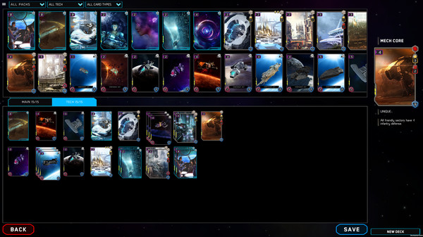 A collectible card game featuring spaceship combat. Take command of a capital ship and launch fighters, bombers and more to attack the enemy player's capital ship. Build your deck from one of four premium color card sets, or combine cards from multiple sets to create your own unique playstyle.